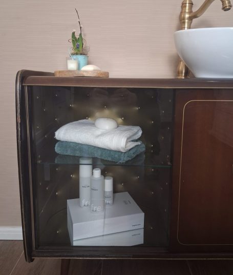 Mit Glasvitriene. Ideal für passende Deko im Bad.