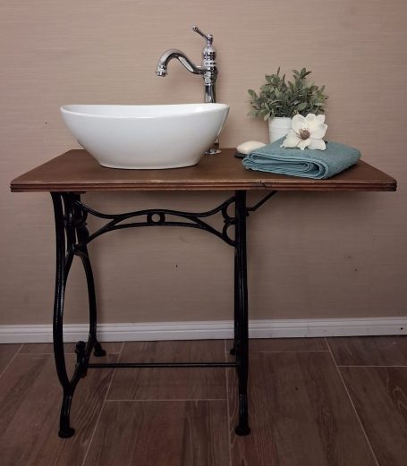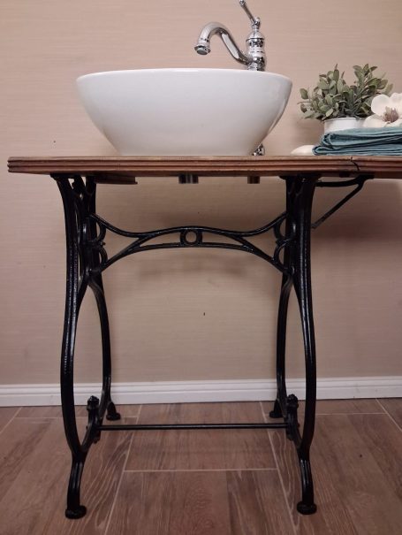 Ein Hauch von Extravaganz bringt dieses schöne Stück in jedes Badezimmer oder Gäste-WC. Als ehemaliger Nähtisch sticht dieses schöne Möbelstück nun künftig als eleganter Waschtisch hervor. Der Stil aus vergangener Zeit verleiht jedem Raum eine besondere Note.